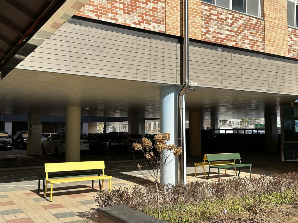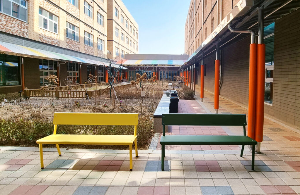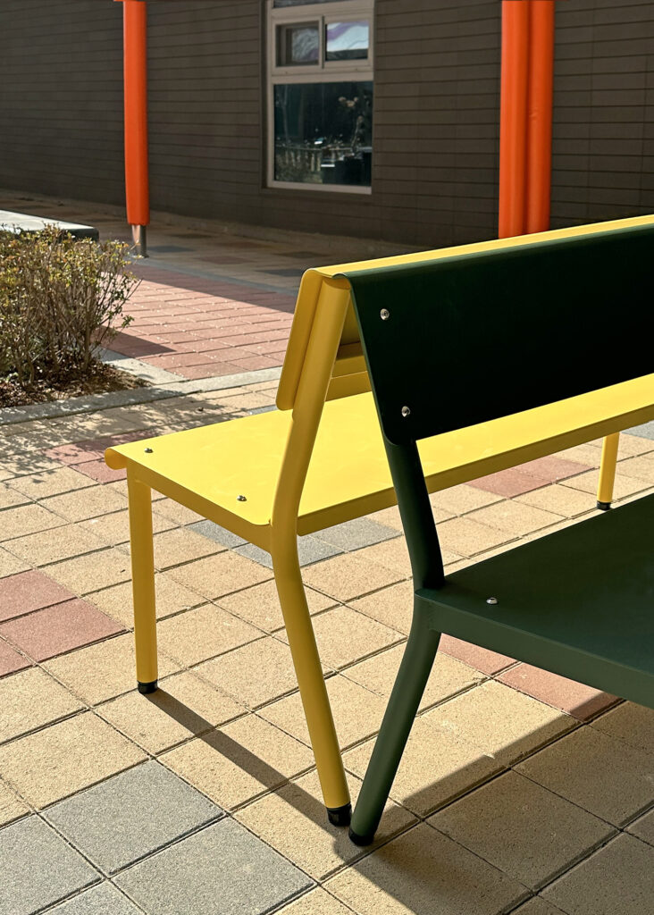 옐로우 & 딥그린 벤치 조합은 특히 어린이 공간에서 사랑받고 있습니다.
